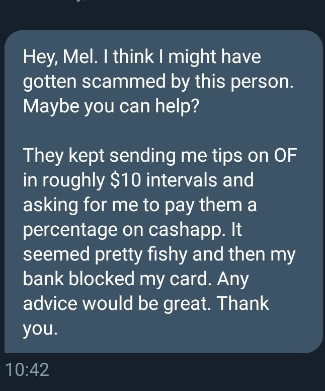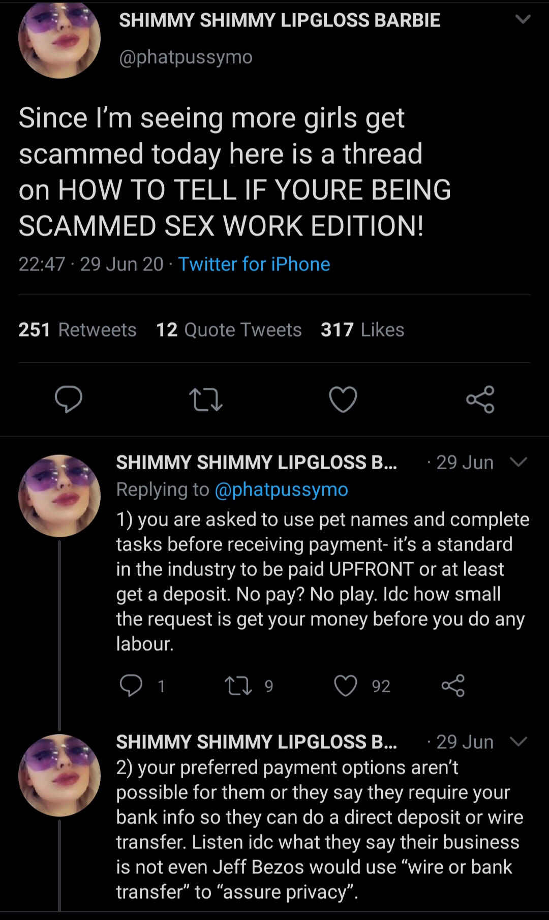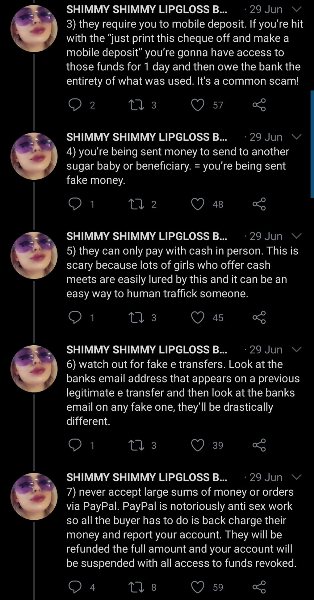 The basic scams/scam techniques:-claim to be a "sugar daddy/mommy" or give a "cashapp blessing", or "sub to a few people" ➡️ 99.9% of the time are scams and bait tweets to gain exposure.-needing payment to "unlock" funds ➡️ SCAM you do NOT need to pay a fee to receive funds-requires ANY form of content, services or "verification pictures" before paying ➡️ SCAM they just want freebies!-asks for a portion of money to be sent back ➡️100% a scam-asking to buy wishlist items ➡️ ALWAYS wait until you have the item in your hands, it can be cancelled!-Exchanging content or services for promotion is scammy and scummy behaviour, there are honest and decent places that will promote you for free or mutual support.-NEVER use someone's bank card, they can get the payment refunded!