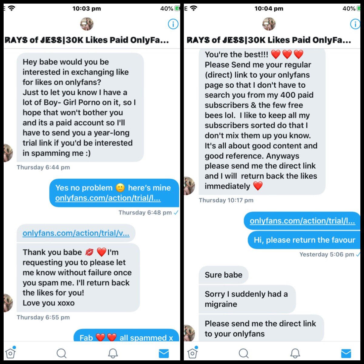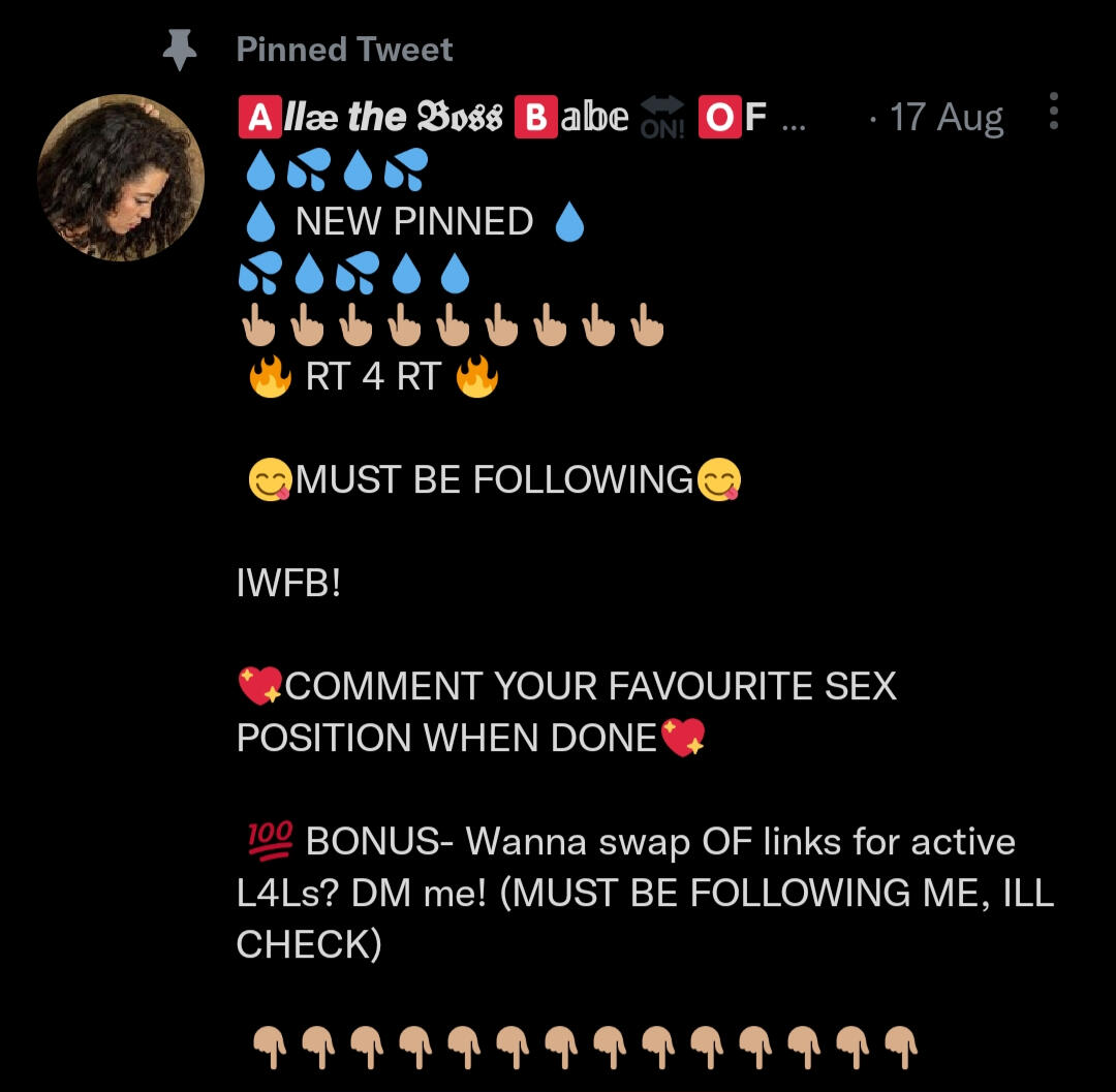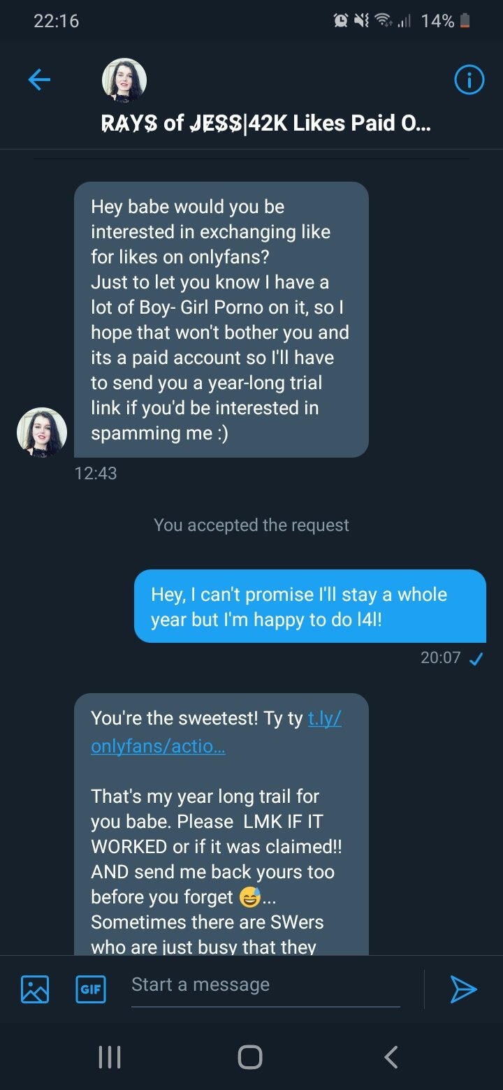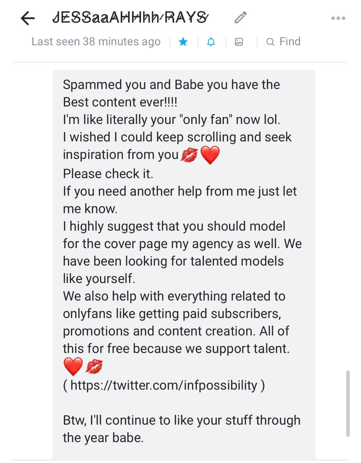 Reason- Steals likes by not returning l4l with other creators, is hostile, rude and abusive when called out, sends phishing links that attempt to hack you, attempts to direct people to a company called infpossibility which is more than likely also some kind of scam. Also sent a mass dm to all her followers claiming to have done their l4l, including those no longer subbedAccounts using this scam tend to use this specific rt4rt thread, watch out! 👇
