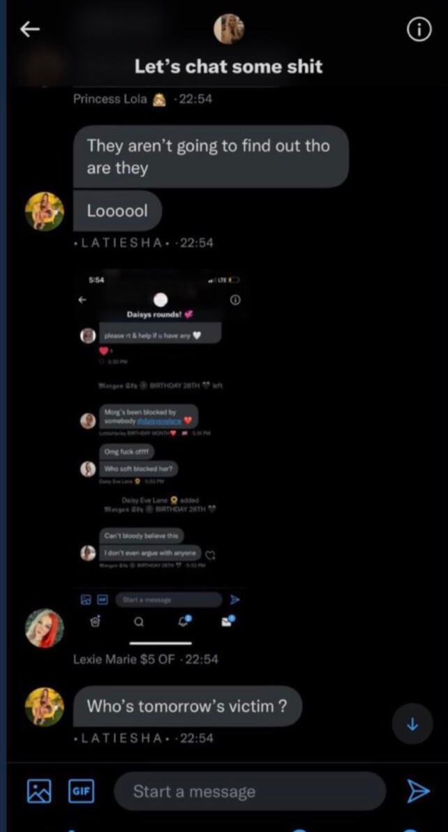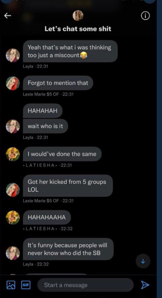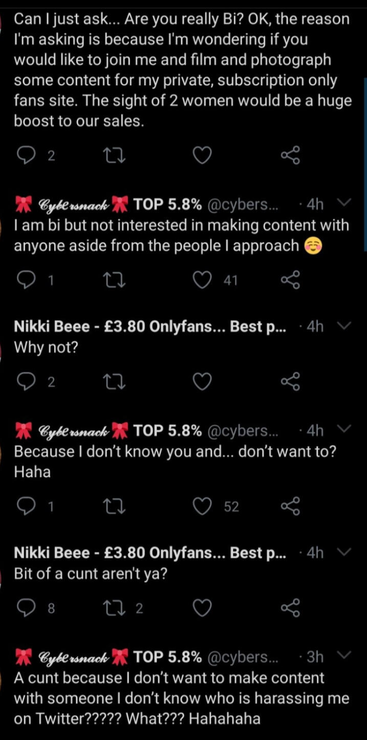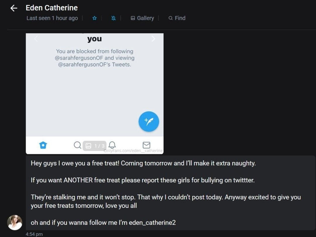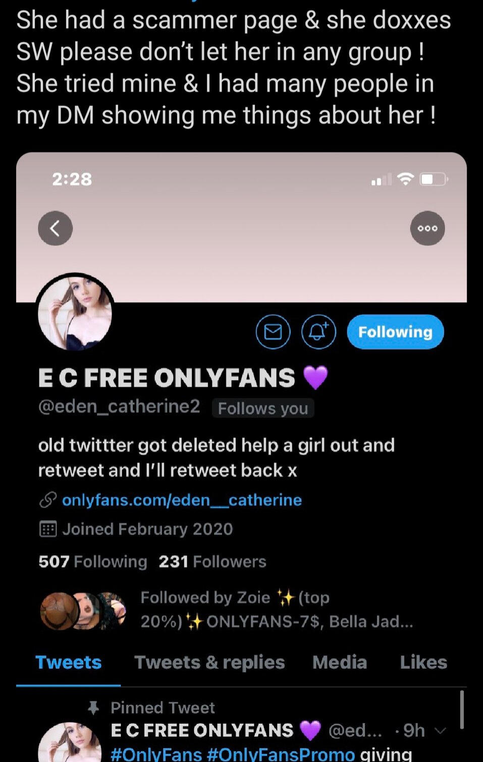 REASON: Tries to bribe her Onlyfans subs to report creators accounts on twitter and onlyfans, these other creators have called her out for being a bully and a scammer, she has also made a 'scammer' Instagram to inform people of scammers on onlyfans those "scammers" are the same girls who called her out. The insta has since been deleted.