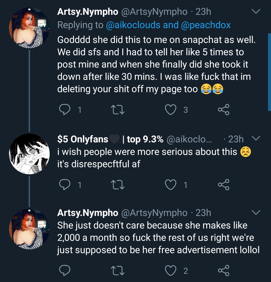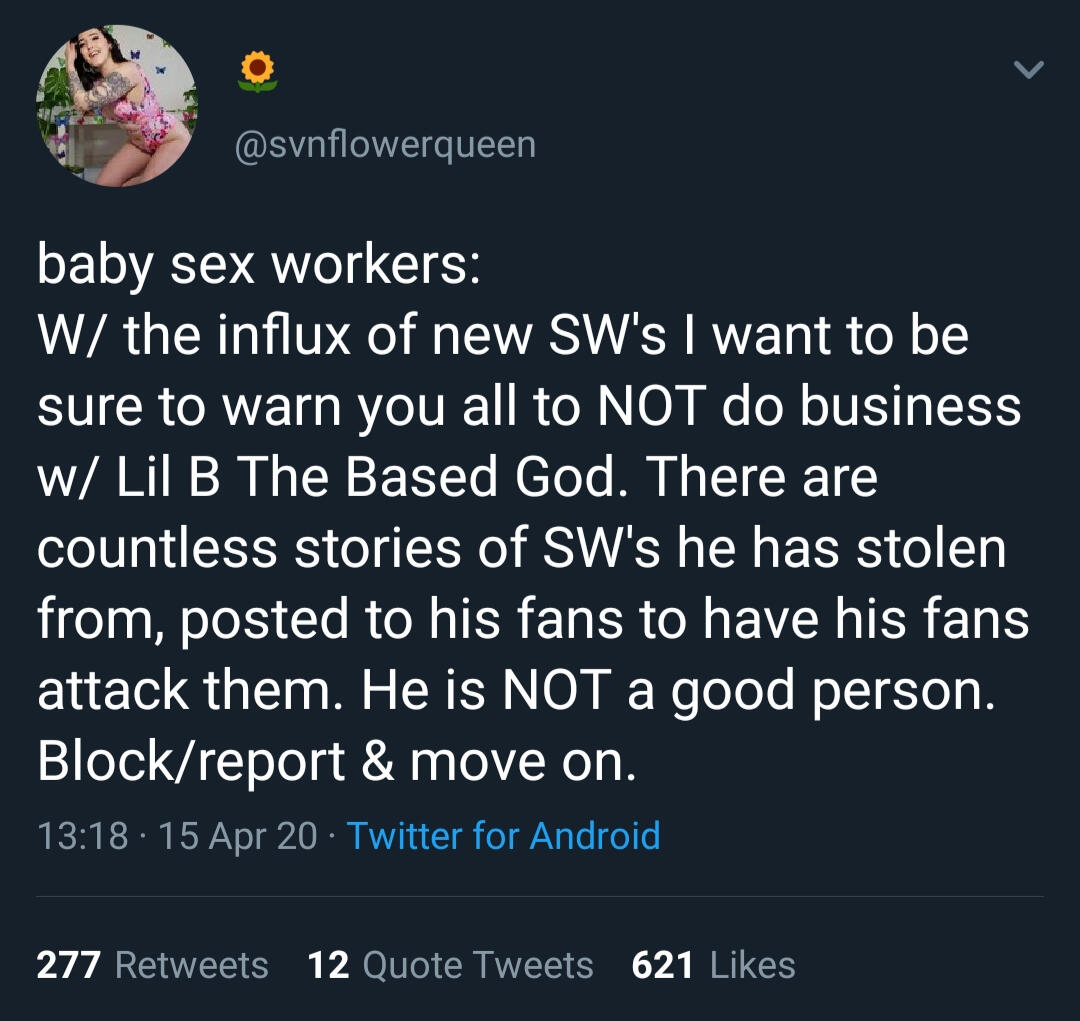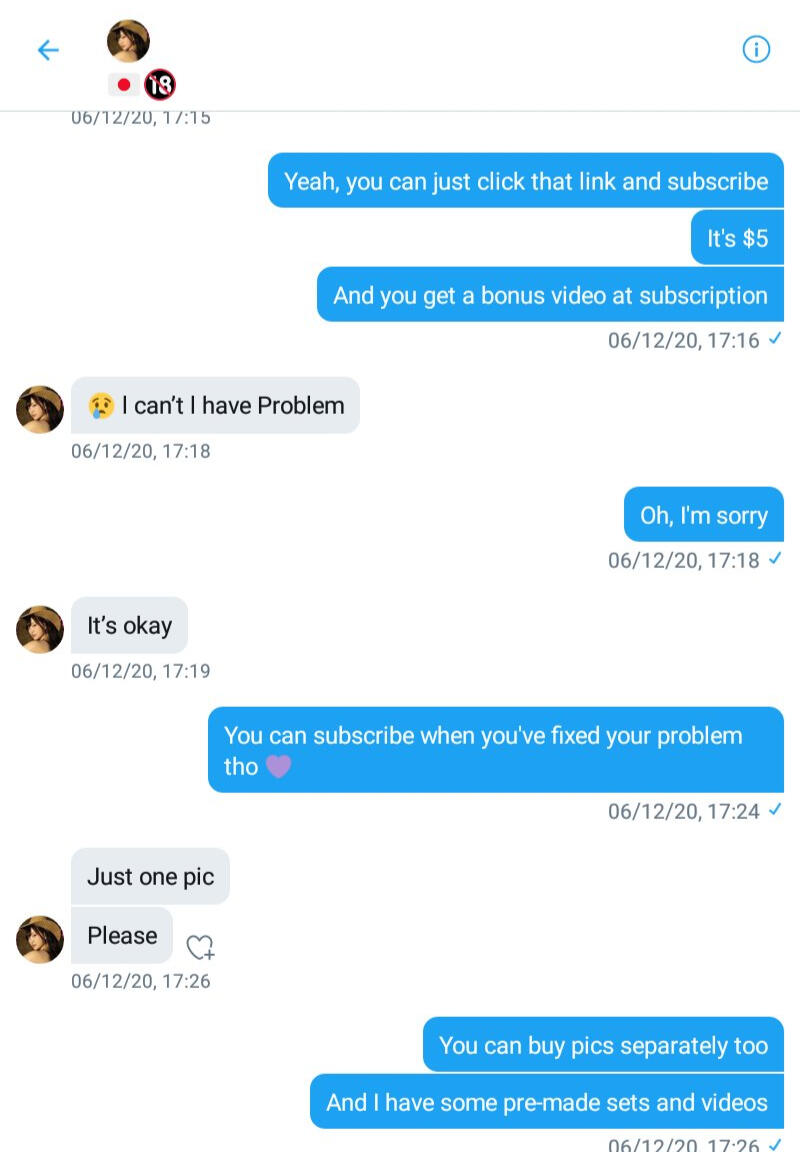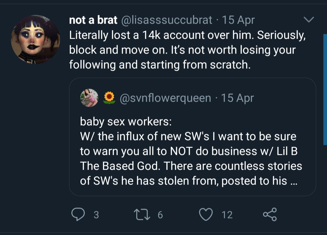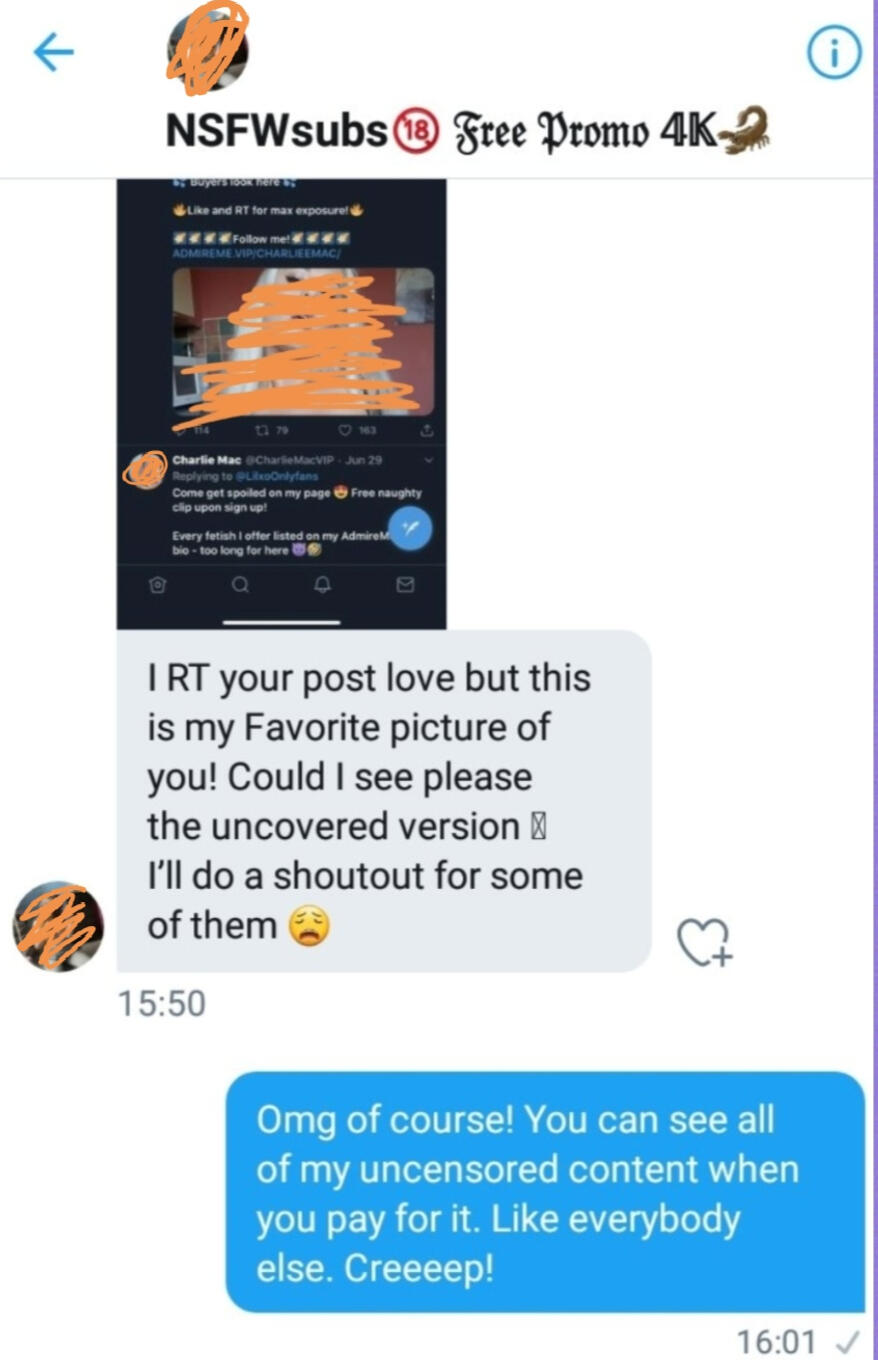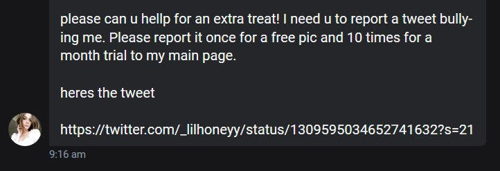 REASON: trying to manipulate sex workers into posting more nudity to their twitter cause they're too broke to afford a sub.