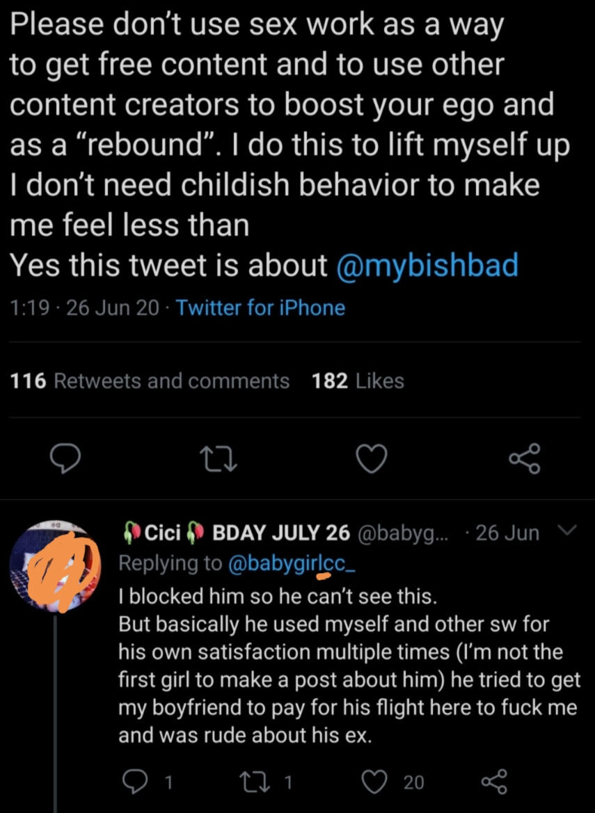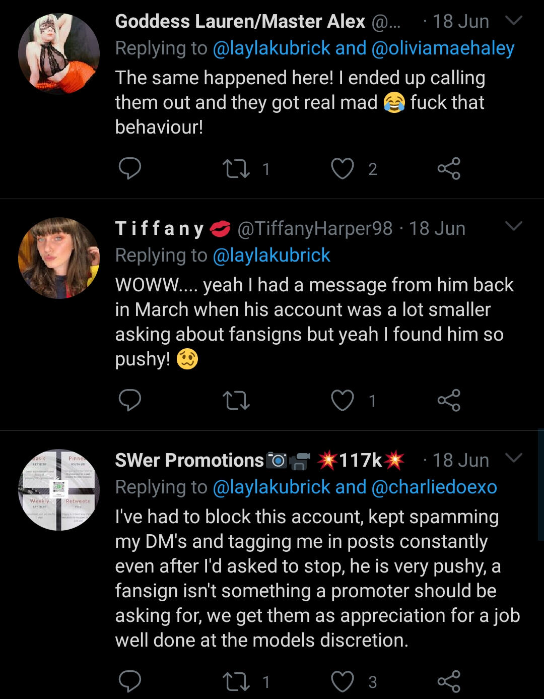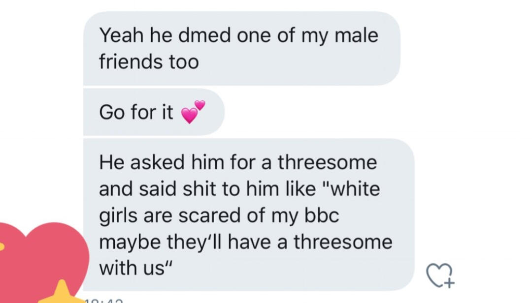 Reason- Steals from sex workers, he may be big but he's a scammer don't fall for his size! He's made many girls lose their twitter accounts and has had his fans attack people.EVIDENCE: