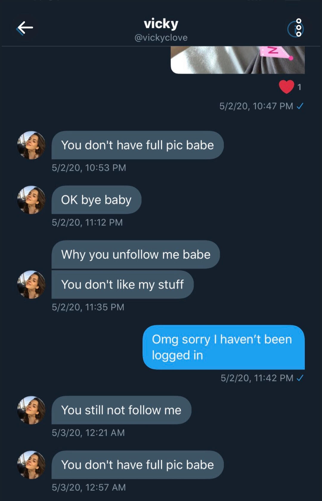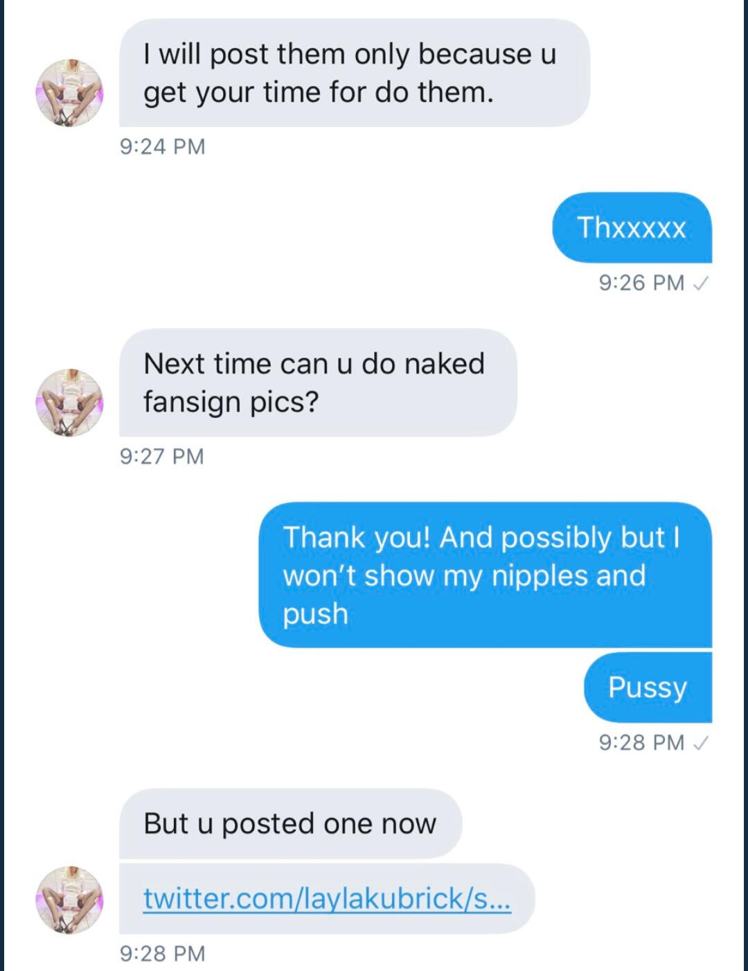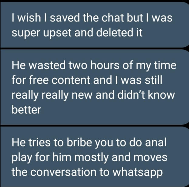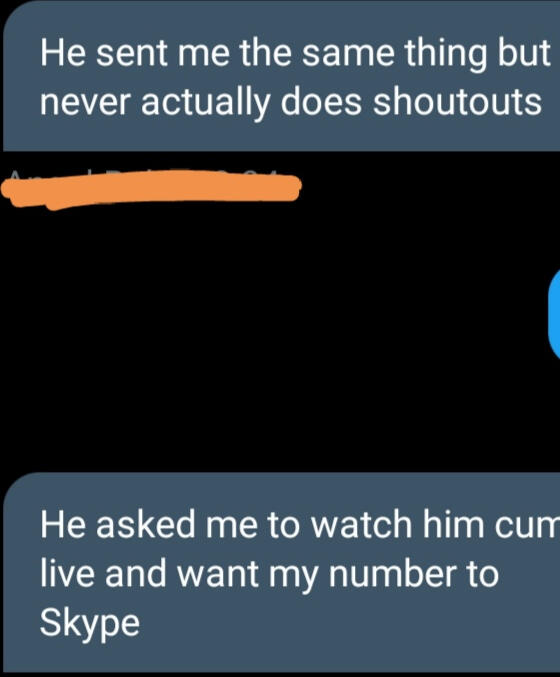 REASON: Super weird account. Will always make the same request of wanting a fansign with thongs or tummy in the pic, he is a time waster and will ask things like do you have wet thongs when you say no.